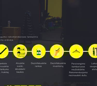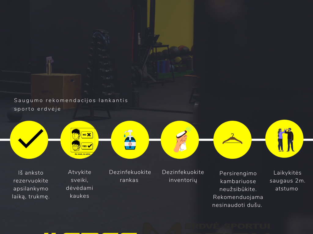 Dėvi apsaugines veido kaukes, dezinfekuoja rankas, dezinfekuoja treniruoklius ir sporto inventorių prieš ir po naudojimosi.